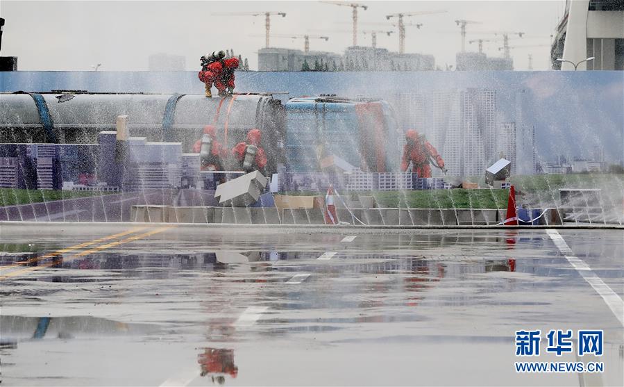 6月3日,救援人員在演練中使用水幕阻擋?;窋U(kuò)散。新華社記者方喆攝。