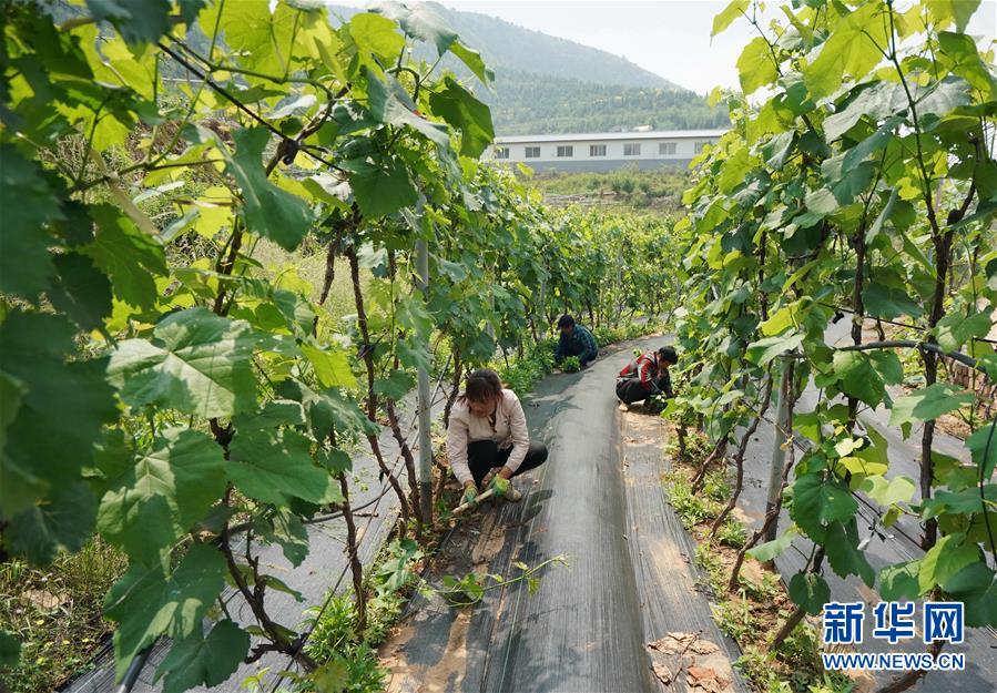 6月4日,唐山市豐潤區(qū)火石營鎮(zhèn)趙莊子村百草坡農產品農民專業(yè)合作社社員在生態(tài)農業(yè)園給葡萄藤除草。新華社記者郭雅茹攝。
