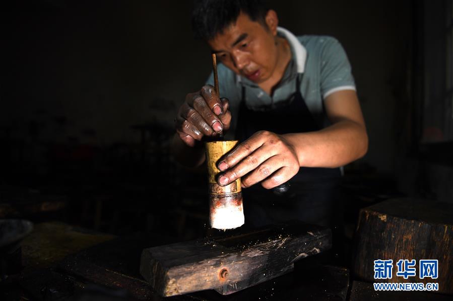 5月21日,安徽歙縣“項(xiàng)氏徽墨”的工人在墨胚上灑金。新華社記者張端攝。