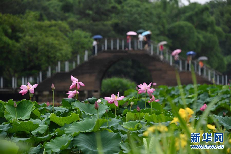 6月7日,一陣小雨過后,福州金山公園內(nèi)盛開的荷花愈加嬌艷欲滴,吸引市民前來游覽。新華社記者姜克紅攝
