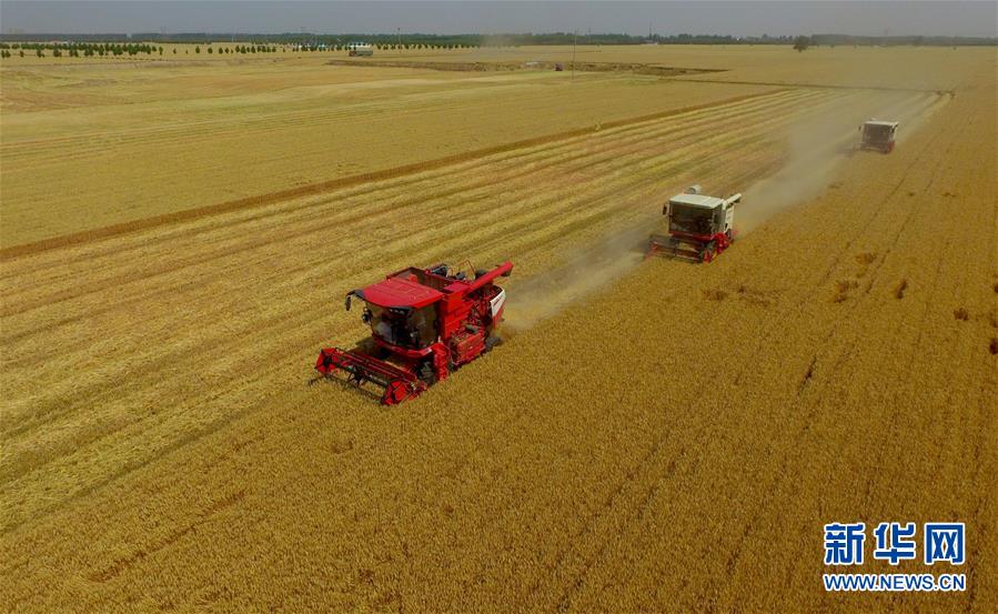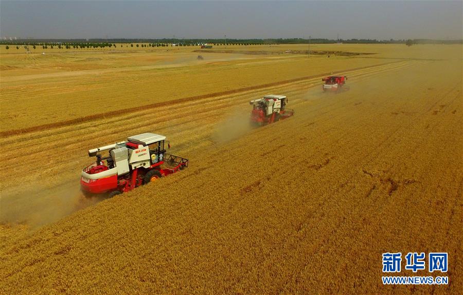 6月8日,聯(lián)合收割機在河北省南和縣閆里鄉(xiāng)閆里村麥田進行夏收作業(yè)(無人機照片)。“三夏”期間,河北省預計組織和調(diào)度小麥聯(lián)合收割機、拖拉機、夏玉米播種機等200萬臺農(nóng)業(yè)機械投入作業(yè)。新華社記者朱旭東攝