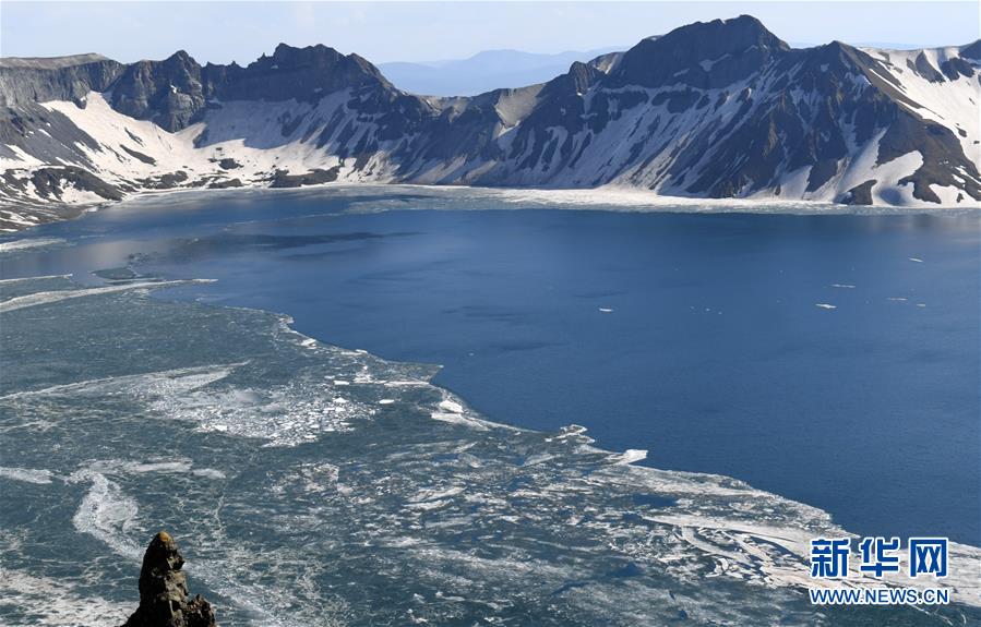 這是6月12日拍攝的長(zhǎng)白山天池。近日,長(zhǎng)白山天池冰層逐漸消融,迎來(lái)“開(kāi)冰季”。新華社記者 林宏 攝
