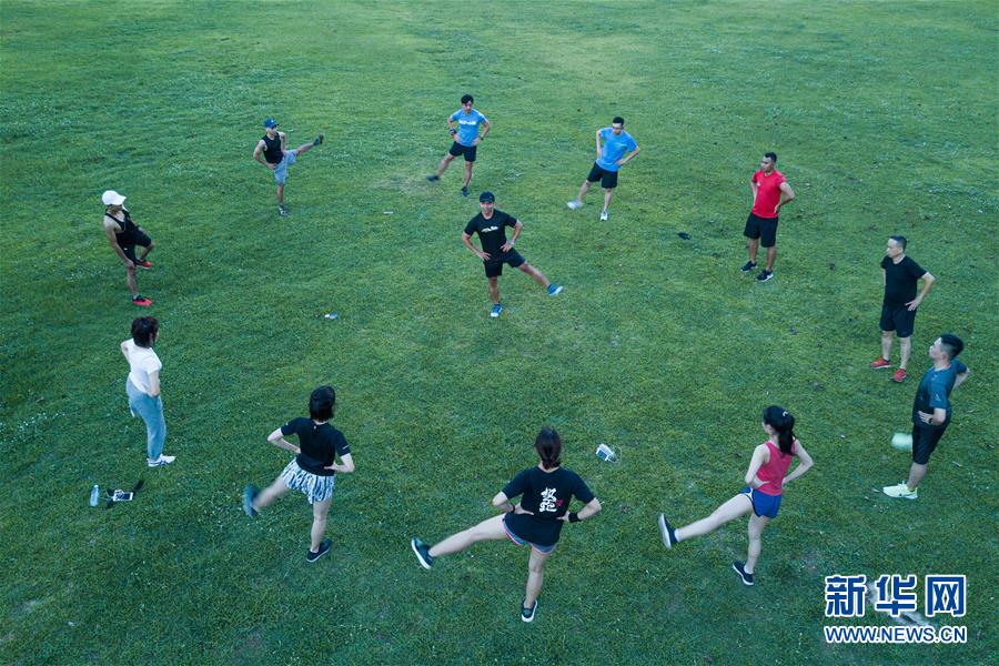 6月11日傍晚,在??谌f綠園,市民在夜跑前做熱身運動(無人機拍攝)。近年來,夜跑成為越來越多都市人熱衷的健身方式之一。在海南??冢慨?dāng)夜幕降臨,“夜跑族”來到??谌f綠園、世紀公園等夜跑場所跑步,用一身酣暢淋漓的汗水?dāng)[脫白天工作中的壓力,享受跑步帶來的歡愉。新華社記者 蒲曉旭 攝