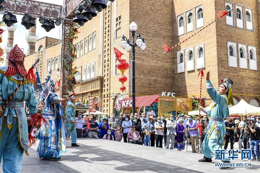 6月12日,在位于烏魯木齊大巴扎景區(qū)內(nèi)的活動現(xiàn)場,烏魯木齊秦劇團的演員在表演國家級非物質(zhì)文化遺產(chǎn)——秦腔。6月12日,“文旅融合,文物賦彩,非遺傳承,健康生活”2020年烏魯木齊市天山區(qū)文化和自然遺產(chǎn)日推介展演活動在大巴扎景區(qū)舉辦,吸引不少游客和市民觀賞。新華社記者王菲攝。