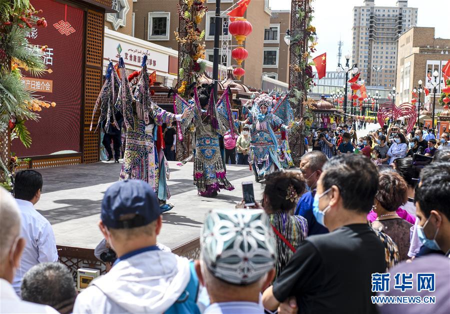 6月12日,在位于烏魯木齊大巴扎景區(qū)內(nèi)的活動現(xiàn)場,烏魯木齊秦劇團的演員在表演國家級非物質(zhì)文化遺產(chǎn)——秦腔。6月12日,“文旅融合,文物賦彩,非遺傳承,健康生活”2020年烏魯木齊市天山區(qū)文化和自然遺產(chǎn)日推介展演活動在大巴扎景區(qū)舉辦,吸引不少游客和市民觀賞。新華社記者王菲攝。