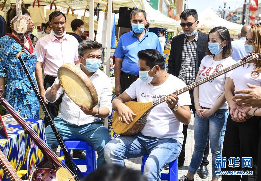 6月12日,在位于烏魯木齊大巴扎景區(qū)內(nèi)的活動現(xiàn)場,新疆維吾爾自治區(qū)非物質(zhì)文化遺產(chǎn)傳承人艾爾肯·吐么爾(左)在“維吾爾族樂器制作技藝”非遺項目展區(qū)演奏都塔爾。6月12日,“文旅融合,文物賦彩,非遺傳承,健康生活”2020年烏魯木齊市天山區(qū)文化和自然遺產(chǎn)日推介展演活動在大巴扎景區(qū)舉辦,吸引不少游客和市民觀賞。新華社記者王菲攝。