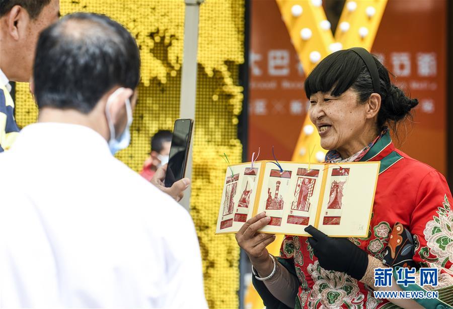 6月12日,在位于烏魯木齊大巴扎景區(qū)內(nèi)的活動現(xiàn)場,手藝人、新疆剪紙技藝傳承人王革(右)向參觀者展示國家級非物質(zhì)文化遺產(chǎn)——中國剪紙。6月12日,“文旅融合,文物賦彩,非遺傳承,健康生活”2020年烏魯木齊市天山區(qū)文化和自然遺產(chǎn)日推介展演活動在大巴扎景區(qū)舉辦,吸引不少游客和市民觀賞。新華社記者王菲攝。