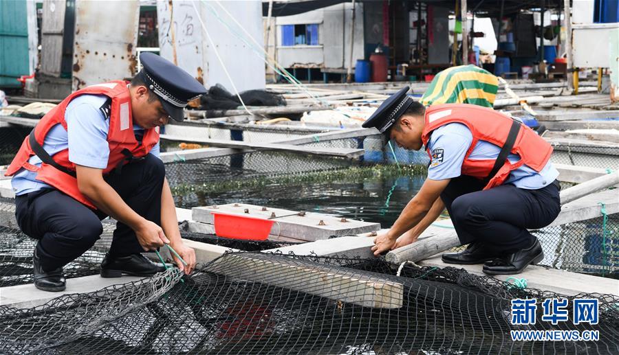 6月13日,海南省公安廳海岸警察總隊(籌備組)陵水支隊民警幫助轄區(qū)內(nèi)漁民固定漁排。當日,海南省氣象局于16時30分繼續(xù)發(fā)布臺風四級預(yù)警。今年第2號臺風“鸚鵡”(熱帶風暴級)預(yù)計于14日在廣東沿海登陸。新華社記者楊冠宇攝。