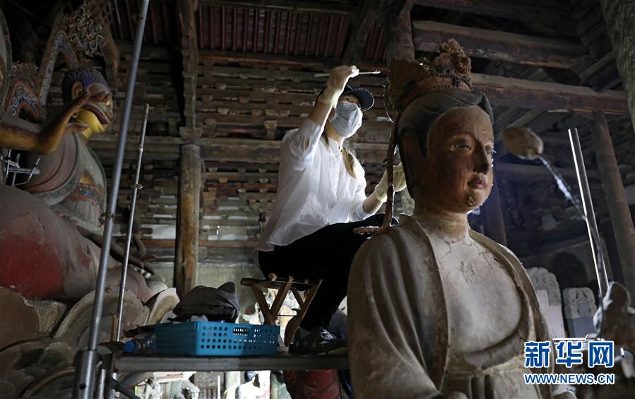 6月8日,工作人員對奉國寺的彩繪泥塑進行保護修復(fù)。