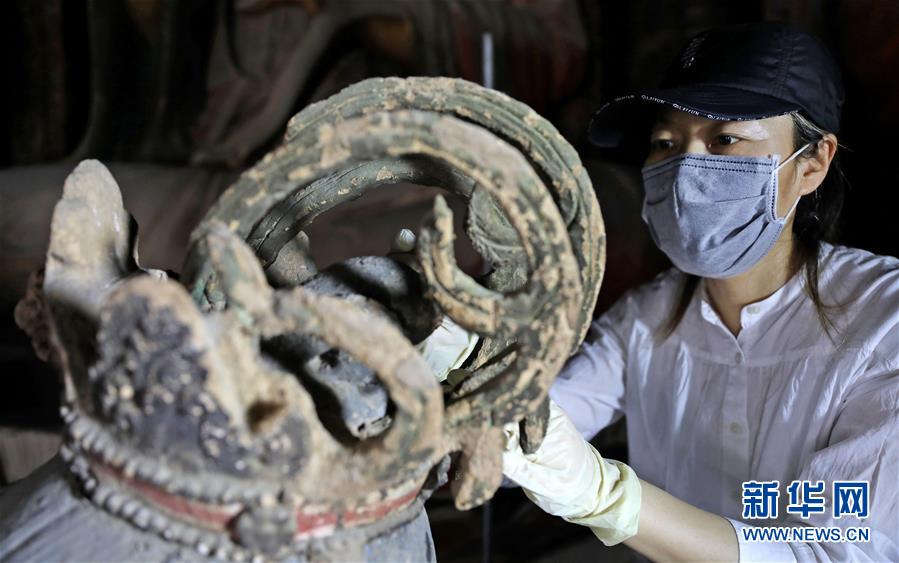 6月8日,工作人員對奉國寺的彩繪泥塑進行保護修復(fù)。新華社記者 姚劍鋒 攝