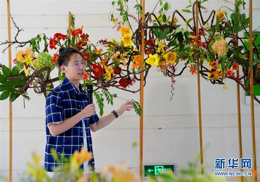 6月13日,第45屆世界技能大賽花藝項目冠軍、上海應用技術大學學生陸亦煒在介紹自己主持設計和創(chuàng)作的花藝作品。當日,“2020中國(上海)萱草文化節(jié)”在上海應用技術大學開幕,校園里數(shù)百個品種的萱草花競相綻放,萱草科研推廣、萱草文化交流等多項活動同時舉行。新華社記者 劉穎 攝