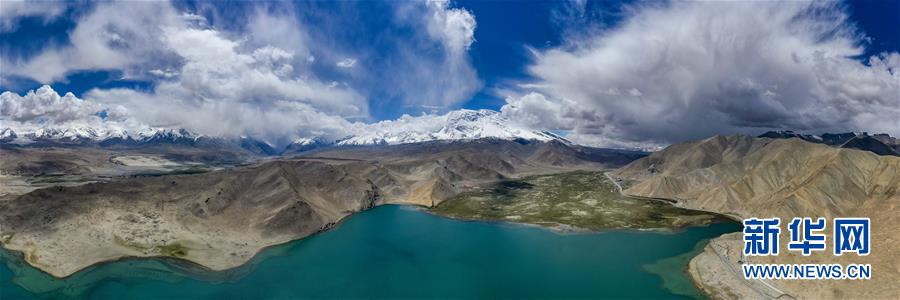 帕米爾高原上喀拉庫勒湖畔連綿的雪山(6月16日攝,無人機(jī)全景照片)。新華社記者 胡虎虎 攝