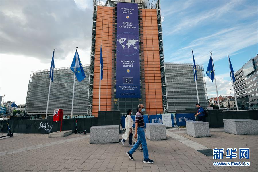 6月13日,在比利時(shí)布魯塞爾,戴口罩的行人走過(guò)歐盟委員會(huì)總部大樓。新華社記者 張鋮 攝