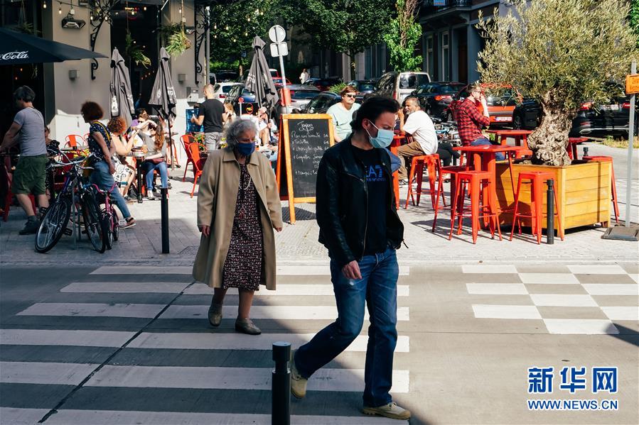 6月13日,戴口罩的行人走在比利時布魯塞爾街頭。新華社記者 張鋮 攝