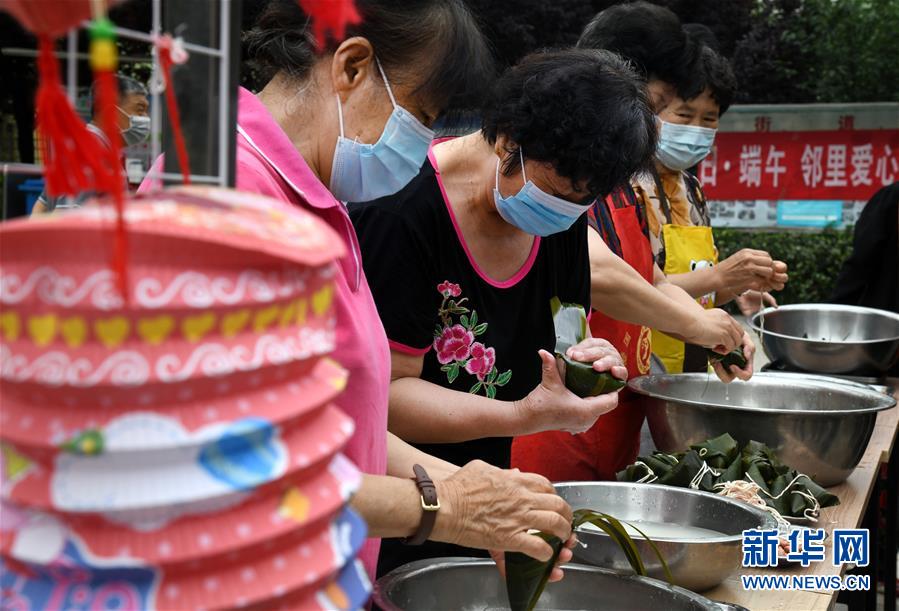 6月17日,水清溝街道居民在社區(qū)廣場上包粽子。當(dāng)日,青島市北區(qū)水清溝街道開展迎端午鄰里愛心傳遞進網(wǎng)格活動,居民通過包粽子、吃粽子、網(wǎng)上端午傳統(tǒng)文化課等形式傳遞鄰里愛心,傳承民俗文化。新華社記者 李紫恒 攝
