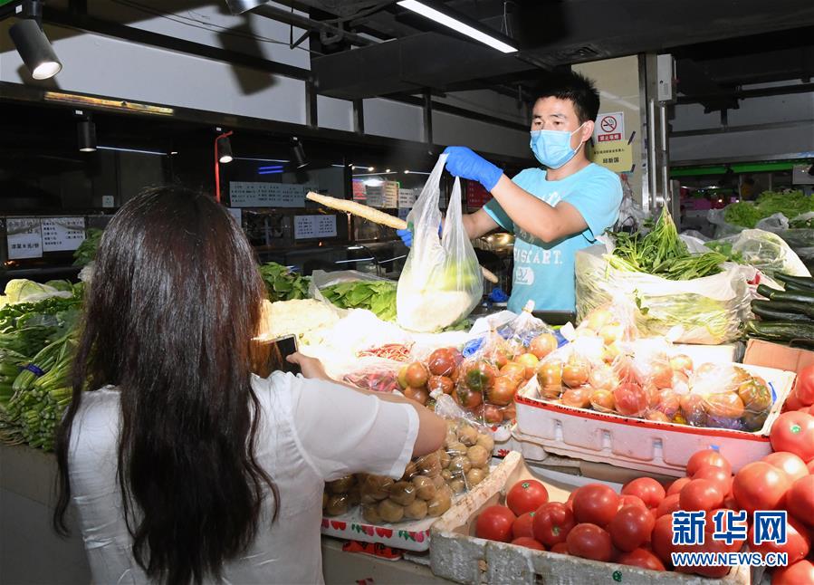 6月17日,在位于北京市海淀區(qū)的增光鴻運(yùn)市場(chǎng),市民(左)在購(gòu)買(mǎi)蔬菜。新華社記者 任超 攝