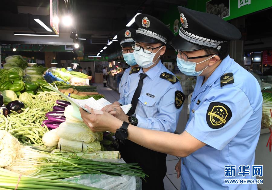6月17日,在位于北京市海淀區(qū)的增光鴻運市場,執(zhí)法人員對商戶所售蔬菜的進(jìn)貨渠道進(jìn)行檢查。新華社記者 任超 攝