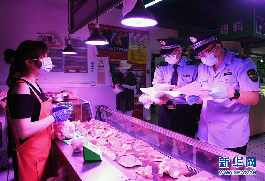 6月17日,在位于北京市海淀區(qū)的增光鴻運(yùn)市場(chǎng),執(zhí)法人員對(duì)商戶所售鮮肉的進(jìn)貨渠道進(jìn)行檢查。新華社記者 任超 攝
