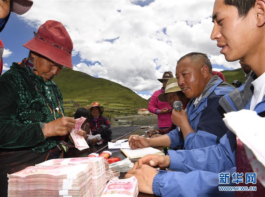 6月13日,壤塘縣尕多鄉(xiāng)瑟谷村熱不卡小組村民領取在蔬菜基地務工的工資。新華社記者 劉坤 攝