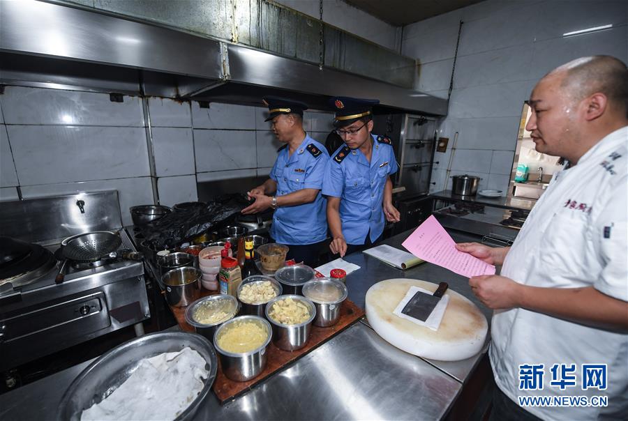 6月17日,市場(chǎng)監(jiān)管執(zhí)法人員在東林鎮(zhèn)一家農(nóng)家樂(lè)內(nèi)開(kāi)展專項(xiàng)執(zhí)法行動(dòng),檢查是否存在非法經(jīng)營(yíng)和加工野生動(dòng)物的情況。新華社記者 徐昱 攝