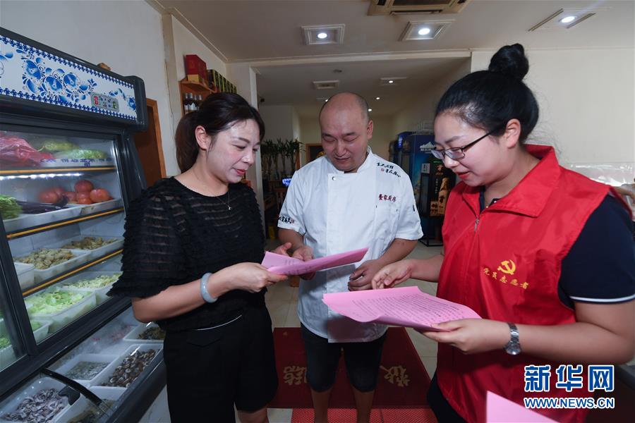 6月17日,黨員志愿者(右)在東林鎮(zhèn)一家農(nóng)家樂(lè)內(nèi)給經(jīng)營(yíng)戶發(fā)放野生動(dòng)物保護(hù)及禁食倡議書。新華社記者 徐昱 攝