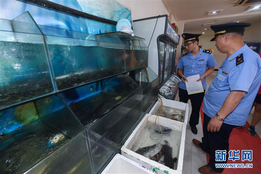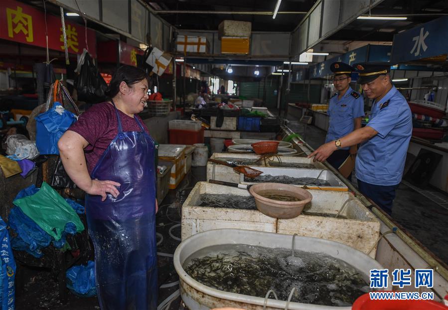 6月17日,市場(chǎng)監(jiān)管執(zhí)法人員在東林鎮(zhèn)農(nóng)貿(mào)市場(chǎng)開(kāi)展專項(xiàng)執(zhí)法行動(dòng),檢查是否存在非法銷售野生動(dòng)物的情況。新華社記者 徐昱 攝