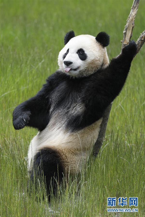 在位于四川省阿壩藏族羌族自治州的九寨溝大熊貓園,大熊貓“海?!痹诖驖L(6月19日攝)。新華社記者沈伯韓攝