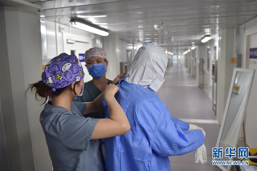 6月19日,在北京地壇醫(yī)院隔離病房外,護(hù)士在穿防護(hù)服。新華社記者彭子洋攝