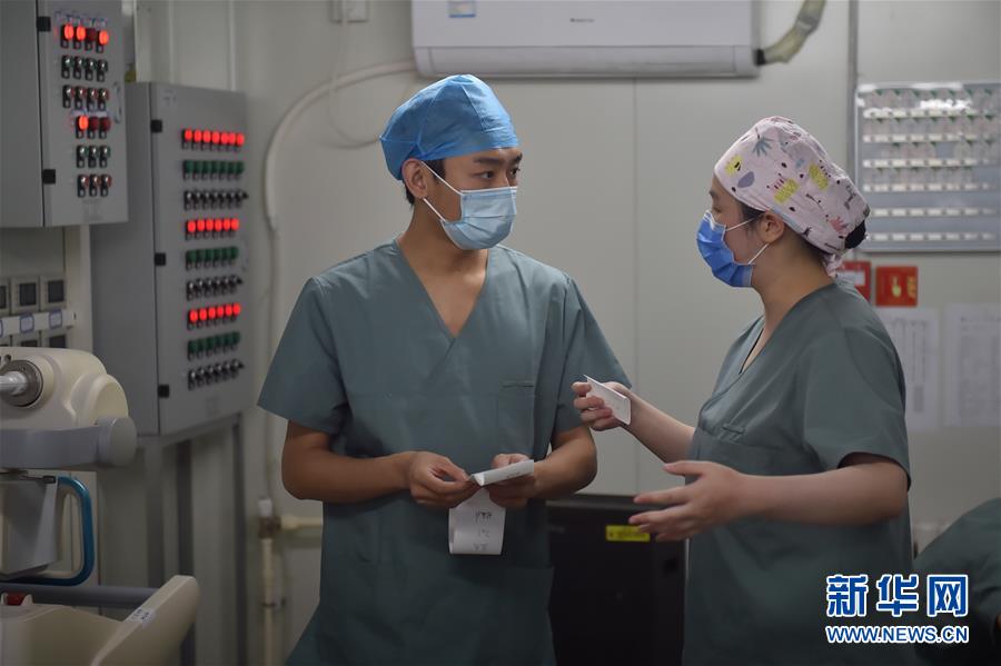 6月19日,在北京地壇醫(yī)院隔離病區(qū),一名來(lái)地壇醫(yī)院支援的護(hù)士(左)在跟地壇醫(yī)院的護(hù)士學(xué)習(xí)使用對(duì)講機(jī)。新華社記者彭子洋攝