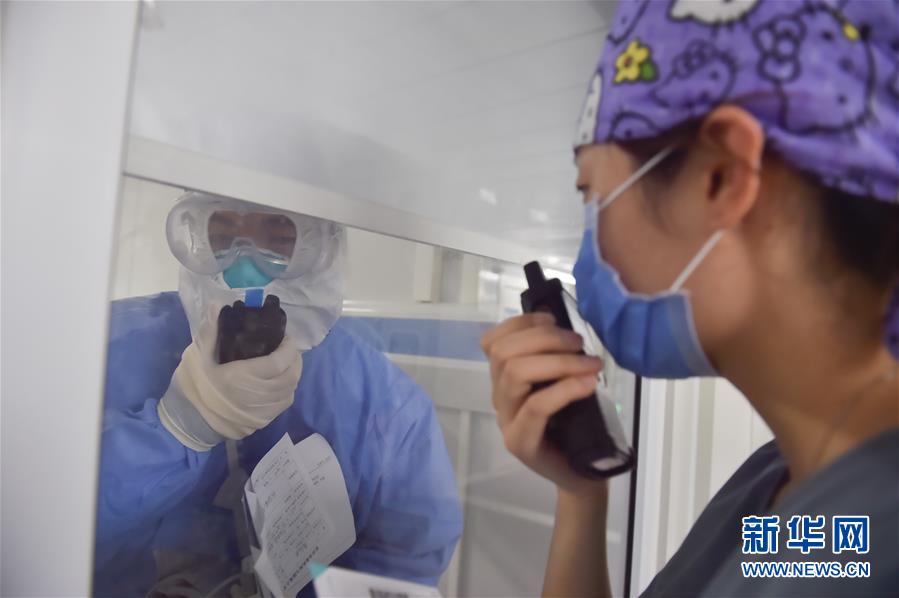 6月19日,在北京地壇醫(yī)院隔離病區(qū),一名來地壇醫(yī)院支援的護(hù)士(左)在跟地壇醫(yī)院的護(hù)士學(xué)習(xí)使用對(duì)講機(jī)。新華社記者彭子洋攝