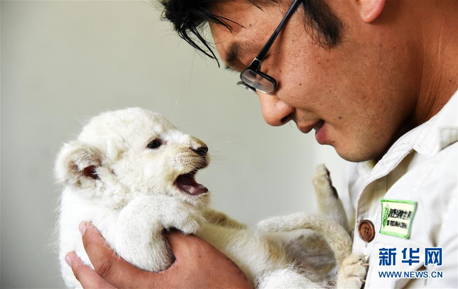 6月14日,濟(jì)南野生動物世界飼養(yǎng)員何樹寶與一只滿月小白獅在一起。新華社記者王凱攝