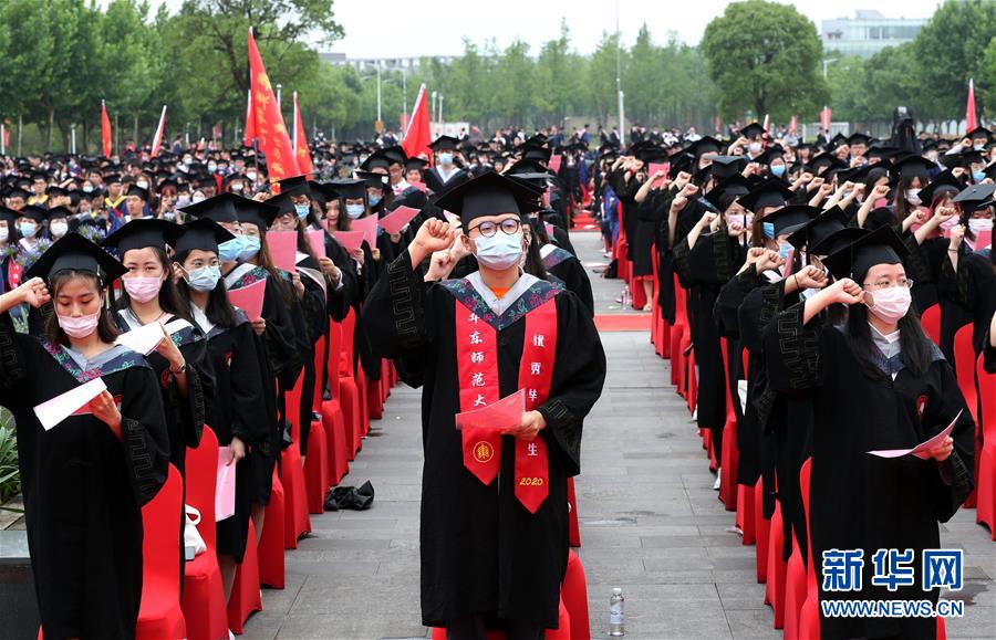 6月23日,在華東師范大學(xué)閔行校區(qū)的畢業(yè)典禮上,師范專業(yè)的畢業(yè)生舉行宣誓儀式。當(dāng)日,華東師范大學(xué)舉行2020屆畢業(yè)典禮。由于疫情防控需要,今年的典禮在兩個(gè)校區(qū)分別舉辦,并全程在線直播。約7700名華東師范大學(xué)2020屆畢業(yè)生通過現(xiàn)場或“云端”的方式參加畢業(yè)典禮。新華社記者劉穎攝