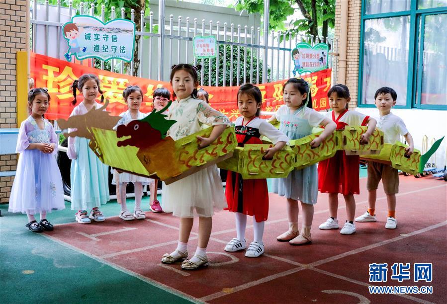 6月23日,長興縣開發(fā)區(qū)實驗幼兒園的孩子們用廢舊的紙箱做成“龍舟”進行表演。為了迎接即將到來的端午節(jié),浙江省湖州市長興縣各個幼兒園開展“品民俗迎端午”主題活動,讓小朋友們體驗傳統(tǒng)民俗文化。新華社記者徐昱攝