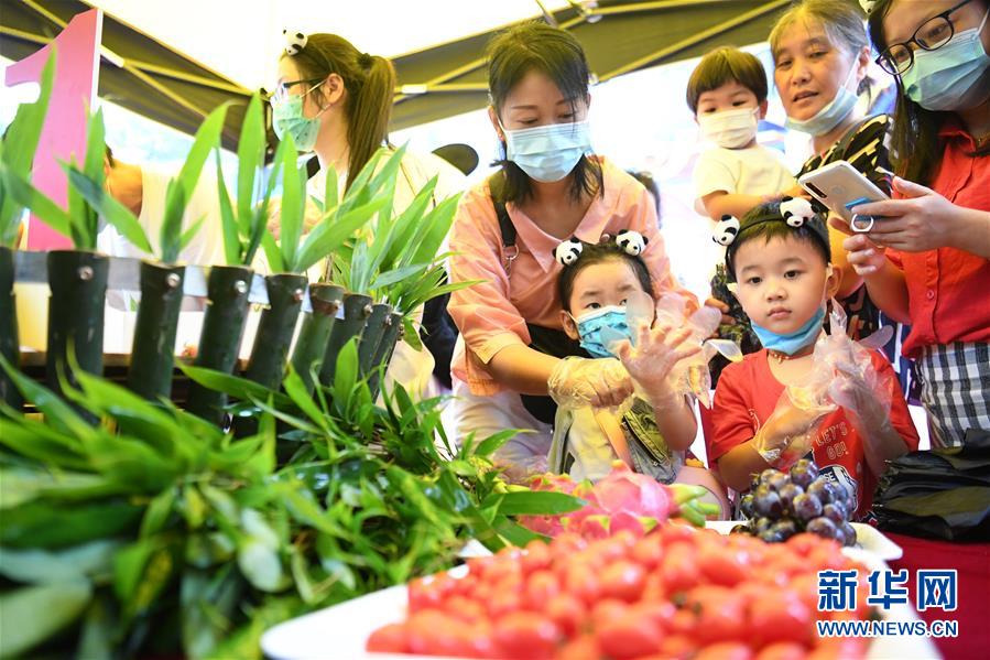 6月23日,參加生日會(huì)的市民游客為大熊貓制作“生日蛋糕”。新華社記者唐奕攝