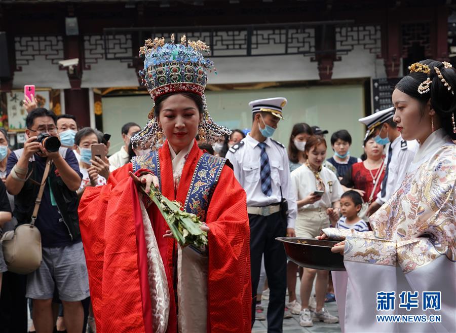 6月24日,在上海豫園舉辦的端午花神國(guó)風(fēng)廟會(huì)上,身著古裝的演員在表演。端午節(jié)臨近,各地舉行包粽子、做香包、賽龍舟等豐富多彩的民俗文化活動(dòng),迎接傳統(tǒng)佳節(jié)的到來。新華社記者劉穎攝