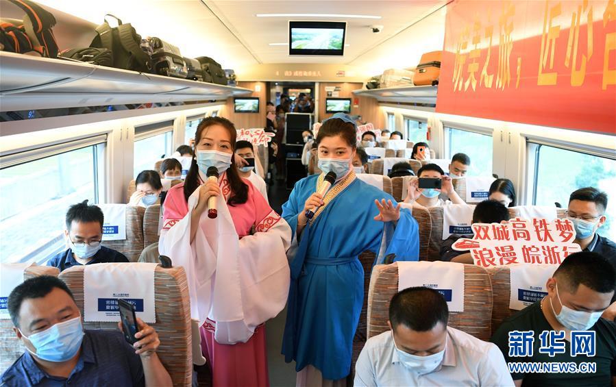 6月28日,合肥客運(yùn)段工作人員在合肥南至杭州東的G9394次列車上為旅客表演節(jié)目。新華社記者劉軍喜攝