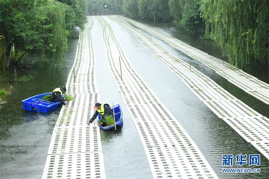 6月29日,工作人員在吳興區(qū)湖東街道的“水上稻田”插秧。今年以來,浙江湖州吳興區(qū)湖東街道開始在轄區(qū)河道大規(guī)模推廣“水上稻田”新型農(nóng)業(yè)項目,利用浮島進行特種水稻種植,既能凈化水體,又能產(chǎn)出生態(tài)稻谷。“水上稻田”預(yù)計在11月實現(xiàn)收割。新華社記者翁忻旸攝