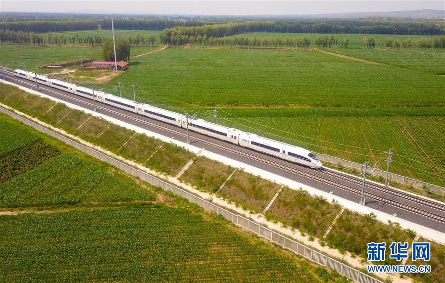 一列“和諧號(hào)”動(dòng)車組列車行駛在內(nèi)蒙古赤峰市元寶山區(qū)的田野間(6月30日攝,無(wú)人機(jī)照片)。新華社記者彭源攝