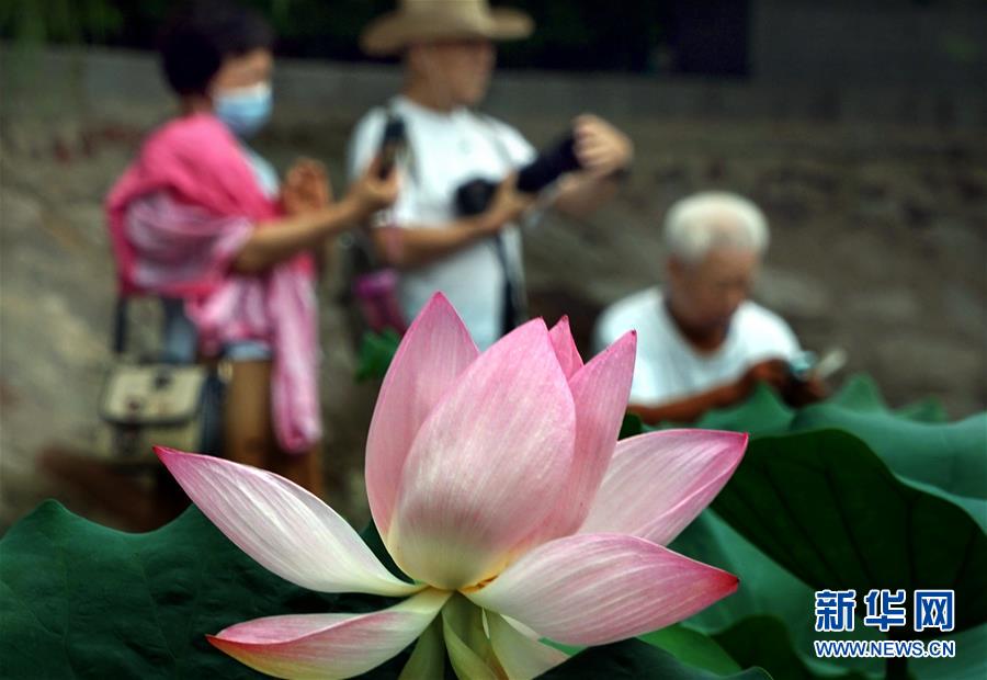 6月30日,市民在河南鄭州紫荊山公園內拍攝荷花。新華社記者李安攝