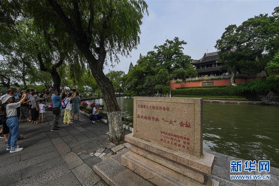 7月1日,游客游覽嘉興南湖景區(qū)的中共一大會(huì)址。新華社記者徐昱攝