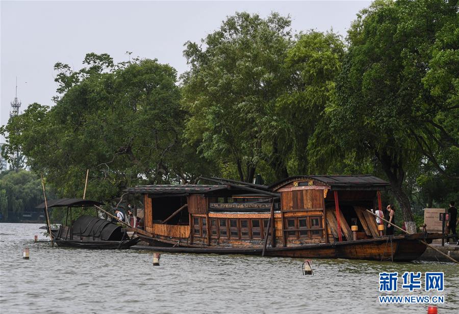7月1日,嘉興南湖景區(qū)內(nèi)停泊的中共一大紀(jì)念船。新華社記者徐昱攝