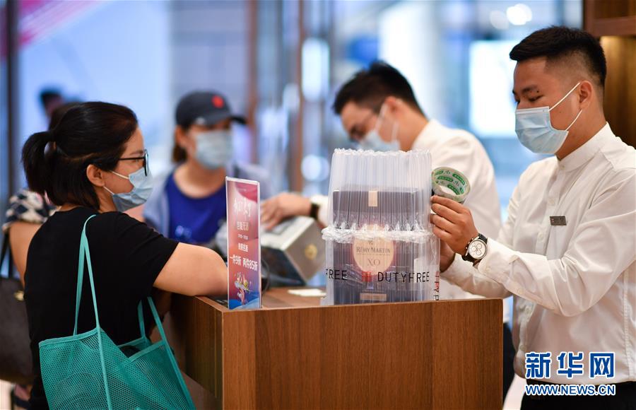 7月1日,??谌赵聫V場免稅店的工作人員為顧客打包酒類商品。當日,海南開始實施調(diào)整后的離島免稅購物政策。海南離島旅客每年每人免稅購物額度提高至10萬元,電子消費產(chǎn)品等7類新增商品開售。新華社記者郭程攝