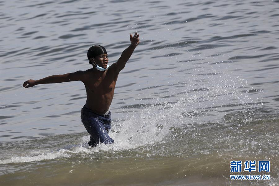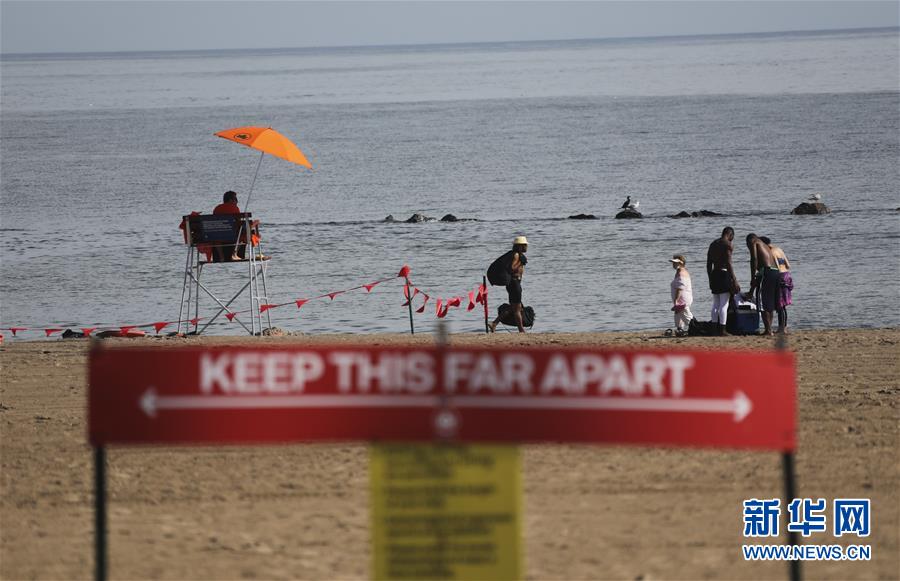 7月1日,人們在美國紐約科尼島戲水。當(dāng)日,美國紐約市屬八處海灘正式重新準(zhǔn)許民眾游泳,救生員也同時上崗。新華社記者王迎攝