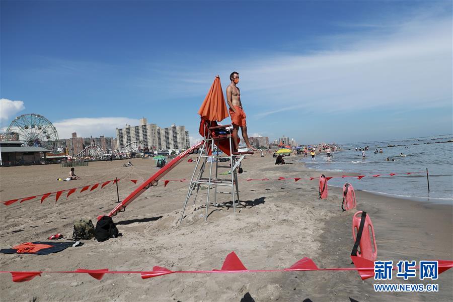 7月1日,救生員在美國紐約科尼島的一處海灘查看海面情況。當(dāng)日,美國紐約市屬八處海灘正式重新準(zhǔn)許民眾游泳,救生員也同時上崗。新華社記者王迎攝