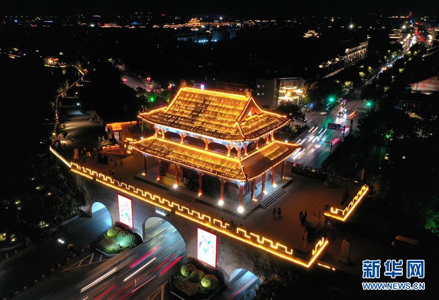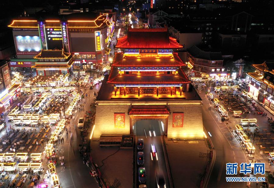 這是6月1日拍攝的河南開封鼓樓夜市(無人機(jī)照片)。新華社記者 李安 攝