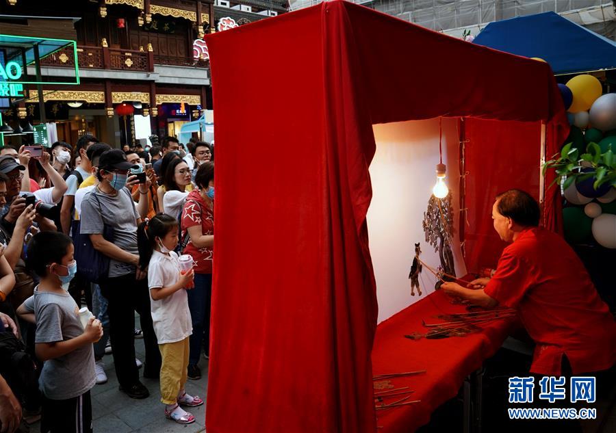 7月3日,游人在上海豫園中心廣場上觀看皮影表演。從7月第一個(gè)周末起,上海豫園原有的“豫園六點(diǎn)半”集市全面升級(jí),煥彩燈光、演藝活動(dòng)和花車集市全線更新,讓市民和游客在觀燈、觀人、觀演的沉浸式體驗(yàn)中,享受夏日特色的“食玩”樂趣。新華社記者 劉穎 攝