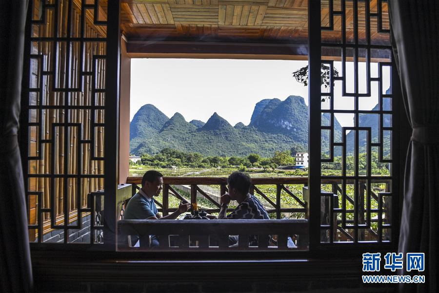 7月4日,游客在廣西陽朔縣一家民宿的陽臺上喝茶聊天。新華社記者曹祎銘攝