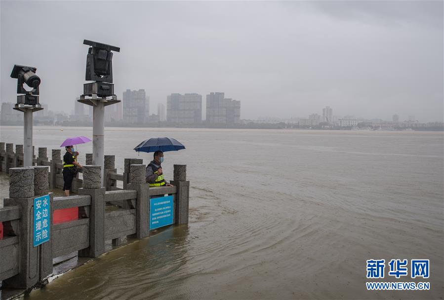 7月6日,工作人員在武漢龍王廟觀察水情。記者6日從武漢市防汛抗旱指揮部辦公室獲悉,5日以來(lái),武漢遭暴雨襲擊,全市多處路段漬水。至6日4時(shí),長(zhǎng)江漢口站超設(shè)防水位1.79米,漢江新溝站超警戒水位0.01米。鑒于當(dāng)前水雨汛情和漬澇情況,武漢市從6日5時(shí)起,將排澇應(yīng)急響應(yīng)級(jí)別提升至Ⅱ級(jí);從6時(shí)30分起,將防汛應(yīng)急響應(yīng)級(jí)別提升至Ⅱ級(jí)。新華社記者肖藝九攝