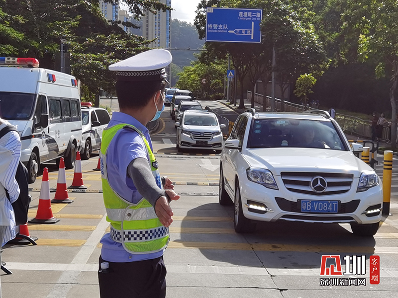 紅嶺中學考點門口正在指揮車輛通行的交警。