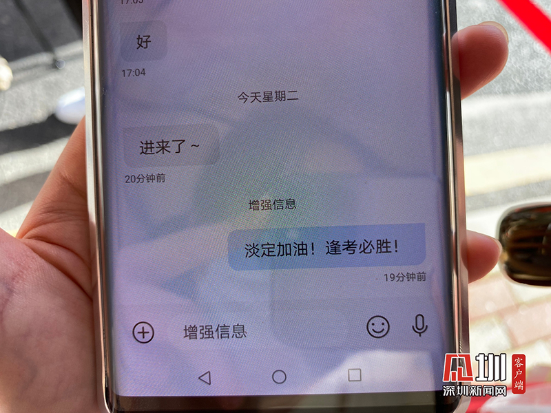 陳女士向記者展示給孩子發(fā)的高考加油短信:淡定,加油,逢考必勝。